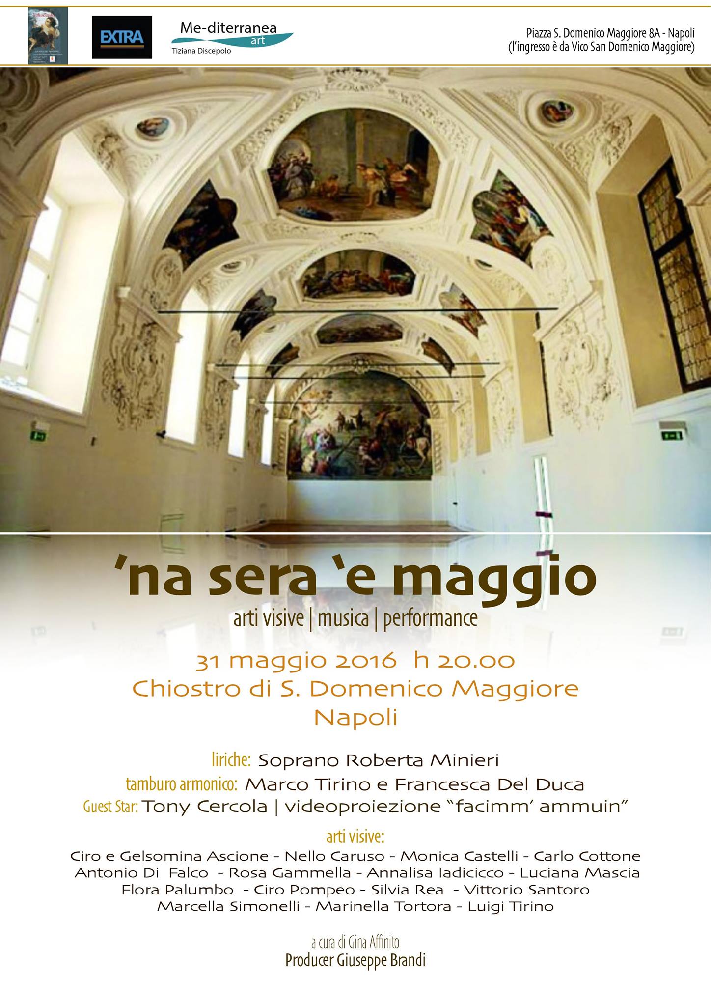 In questo “viaggio” simbolico attraverso le varie forme d’arte, in una serata di fine maggio, avremo il piacere di immergerci nelle arti visive attraverso opere scultoree e pittoriche di artisti del panorama contemporaneo, ascoltare le armoniose e vibranti diffusioni acustiche del duo Marco Tirino e Francesca Del Duca, lasciarci trasportare dalle liriche del Soprano Roberta Minieri e farci accarezzare dagli scatti di Monica Castelli. Guest della serata il percussionista Tony Cercola con la proiezione del videoclip “Facimm' ammuin”.